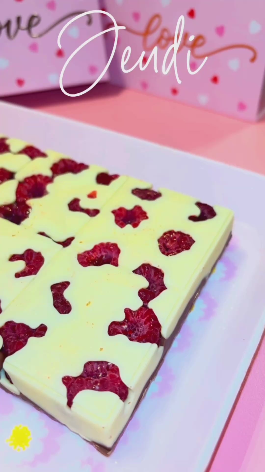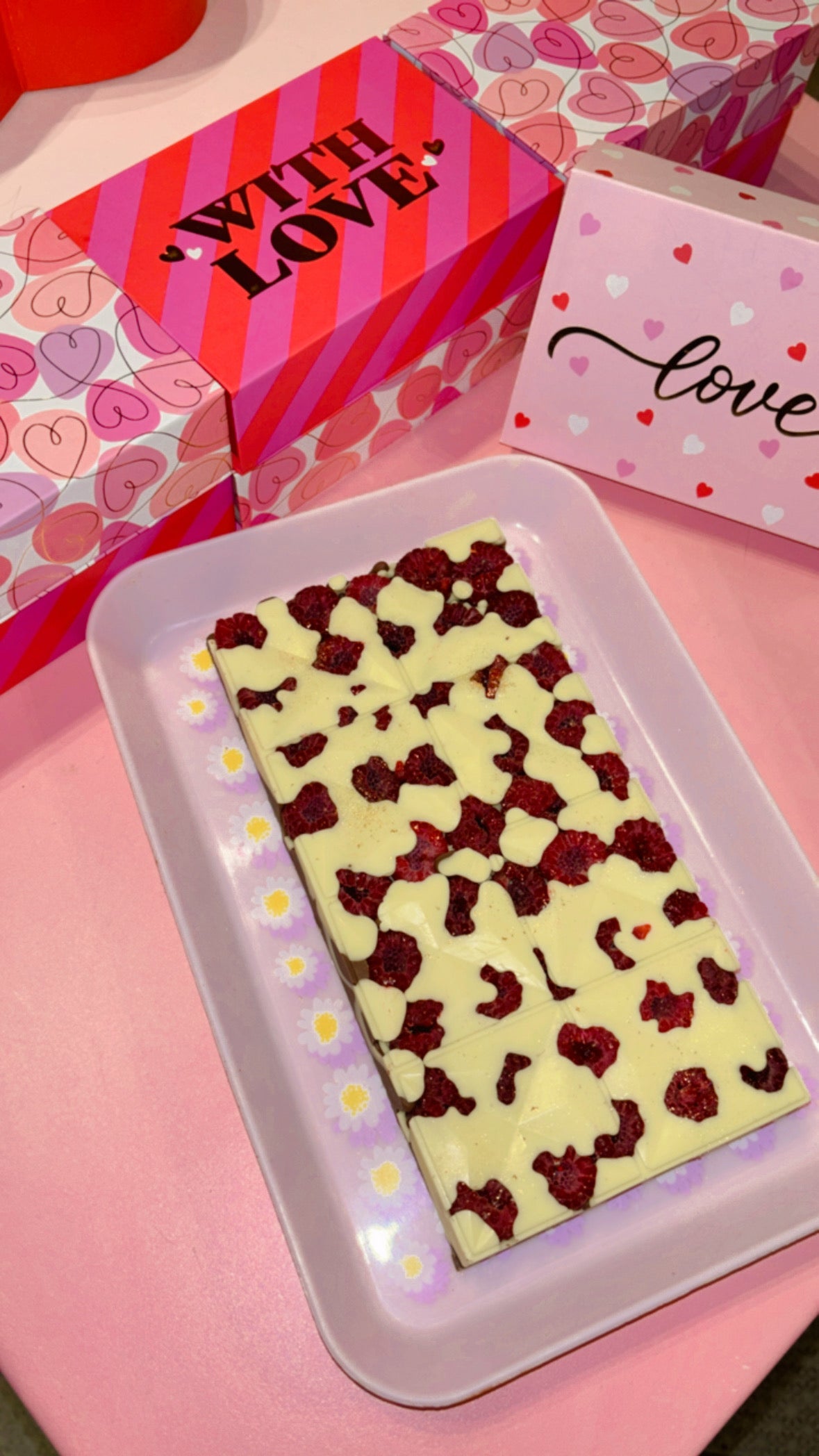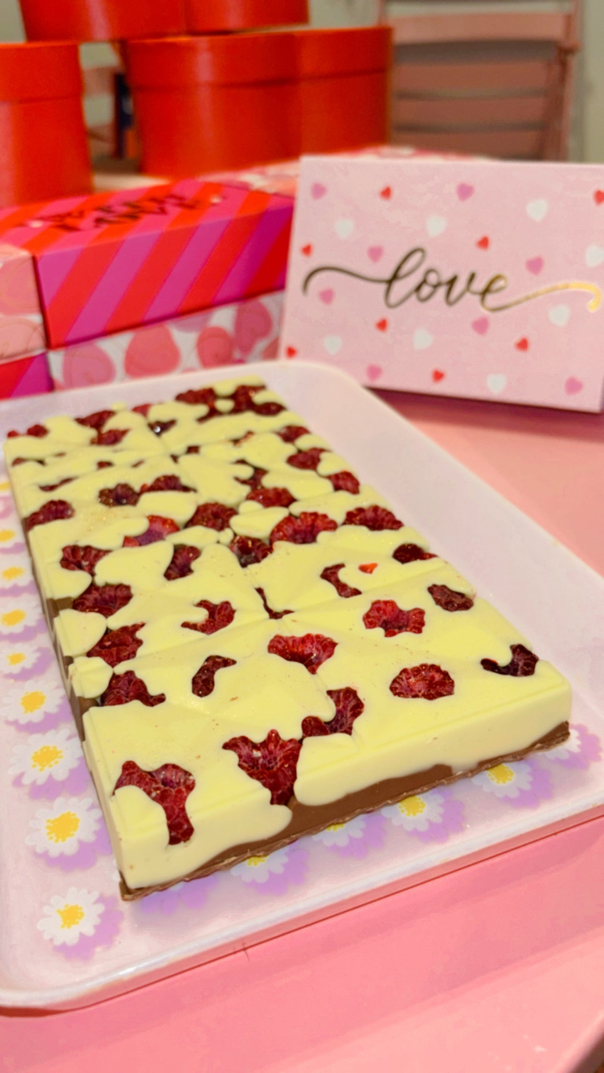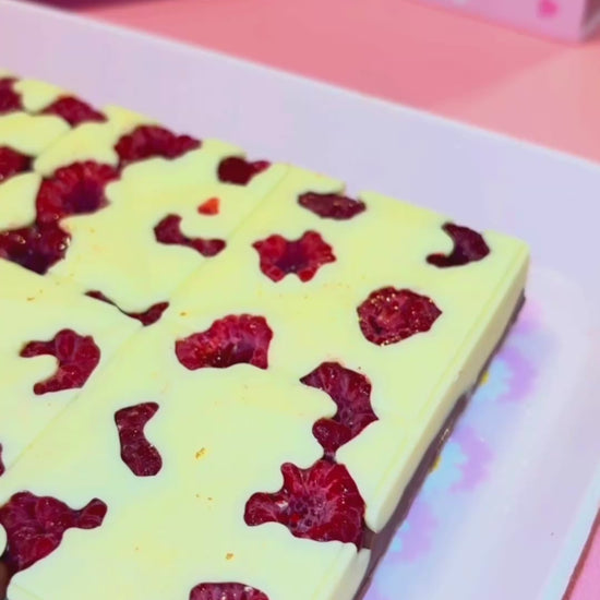 On te présente la tablette Framour XXXL, remplie de framboises, de chocolat blanc et de chocolat au lait